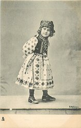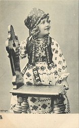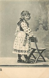 girl in peasant dress stands with hands holding chair, faces front, looking right