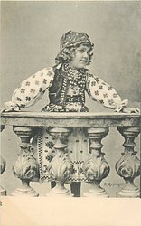 girl in peasant dress stands behind stone palisade, arms outstretched
