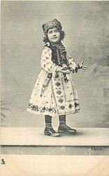 girl in peasant dress stands with hands held out in front