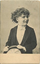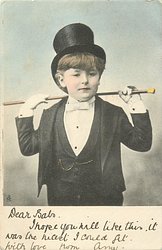 he holds top-hat in his lap holding it with his right hand, frizzy hair