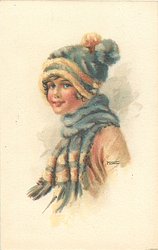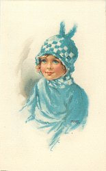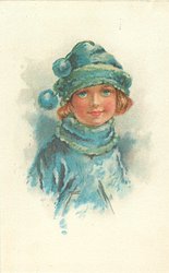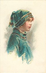 young girl dressed in blue winter outfit, tasselled cap, patterned border to scarf & turtleneck, faces right