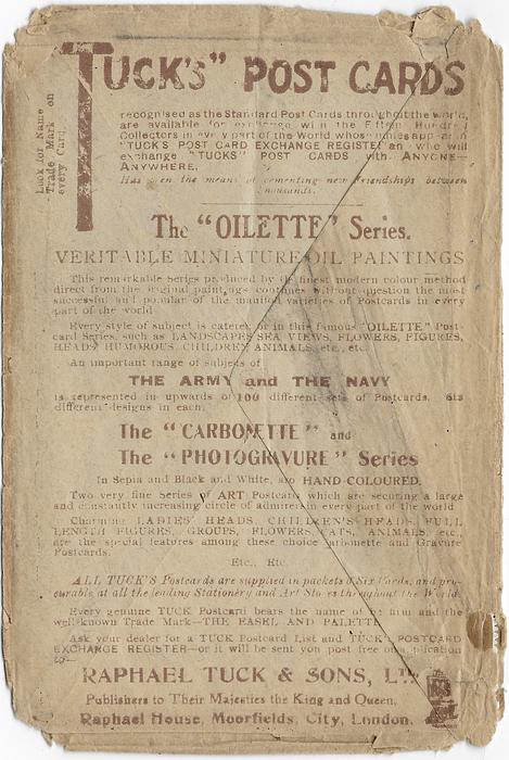 OILETTE, PLATE-MARKED, PRINTED IN ENGLAND, come on heavy stock with embossed margins, listed in 1908/1909 & 1911/1912 Postcard Catalogue, come opt. AMERICAN Y.M.C.A.