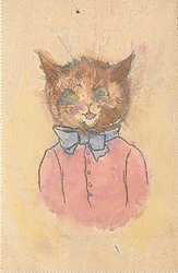 head and shoulders of cat, ribbon in bow on neck, hair on end