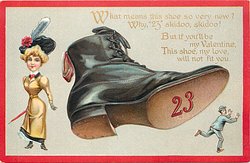 WHAT MEANS THIS SHOE SO VERY NEW? WHY "23" SKIDOO, SKIDOO! BUT IF YOU'LL BE MY VALENTINE, THIS SHOE MY LOVE, WILL NOT FIT YOU.