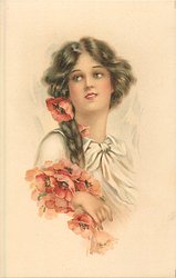 pretty woman in white dress, armfull of pink poppies, looks up/left