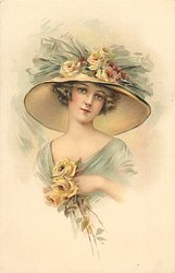 pretty woman in off shoulder blue dress, enormous hat trimmed with roses, three yellow roses, looks front