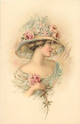 pretty woman in off shoulder blue dress, enormous hat trimmed with roses, single pink rose, looks right