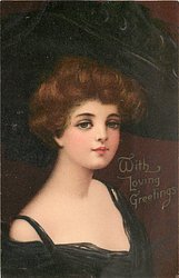 WITH LOVING GREETINGS pretty woman with thin shoulder straps for dress & large hat, shoulders partly right, face front