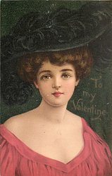 TO MY VALENTINE pretty woman, red dress, large hat, faces & looks front, no frill at neckline
