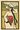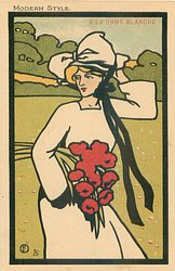 girl in white dress, bunch of red flowers under her right arm, holds hat on with left hand