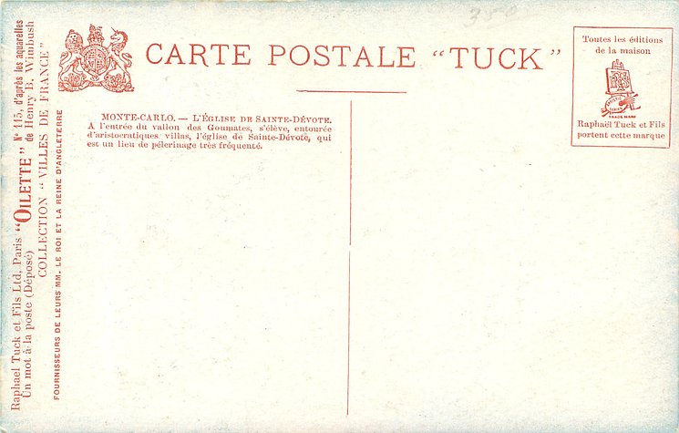 OILETTE, UN MOT A LA POSTE, (DEPOSE) or no trade name, 4 backs, come with & w/o COLLECTION VILLES DE FRANCE, come with & w/o D'APRES LES AQUARELLES DE HENRY B. WIMBUSH, same images SERIE 992 with inset numbers as for this set & MONTE CARLO 7998