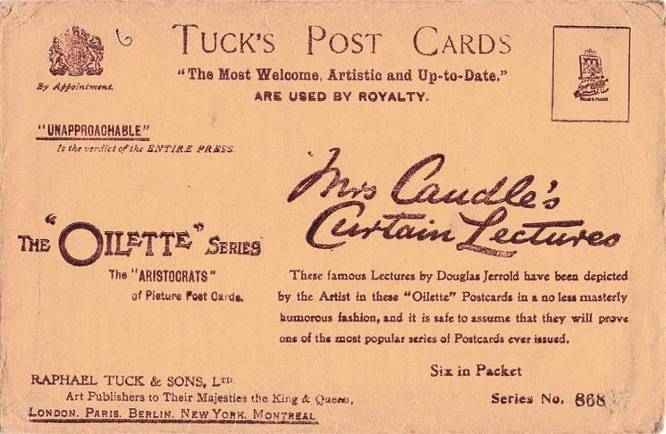 OILETTE, PRINTED IN ENGLAND, come with LECONS D'ALCOVE top & LES PLAISIRS DU MENAGE! or SEMONCE CONJUGALE! bottom. Set Cover has surface damage where 4th digit of series number would be printed. Unclear if it is for SERIES 8683 which has set cover or SERIES 8684.
