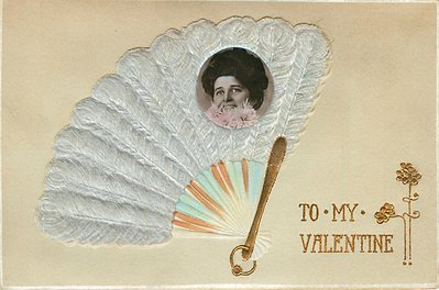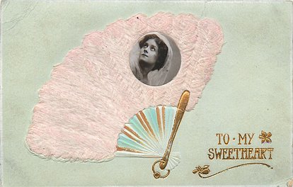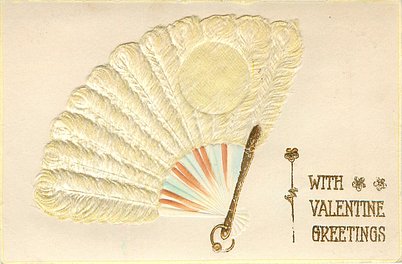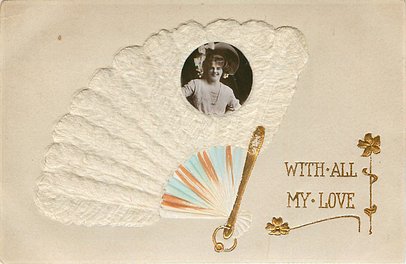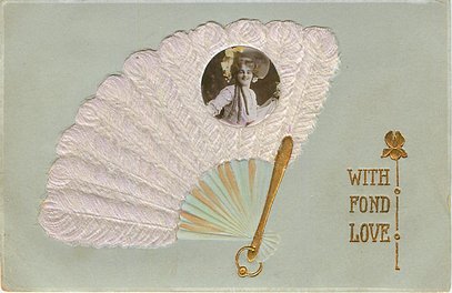 VALENTINE, PRODUCED IN GERMANY, gilt fan handle & wording, fan fabric applique, photo inserts