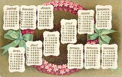 A HAPPY NEW YEAR TO YOU calendar of months for 1908 in front of purple forget-me-not wreath tied with green ribbon