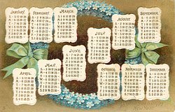 TO WISH YOU A HAPPY NEW YEAR calendar of months for 1908 in front of blue forget-me-not wreath tied with green ribbon