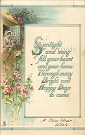 verse:- SUNLIGHT AND SONG FILL YOUR HEART AND YOUR HOME THROUGH MANY BRIGHT AND HAPPY DAYS TO COME., CHROMOGRAPHED IN BAVARIA