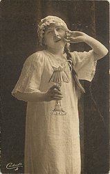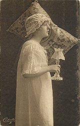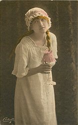 girl in nightgown & cap, poses with candle stick with both hands facing right looking front