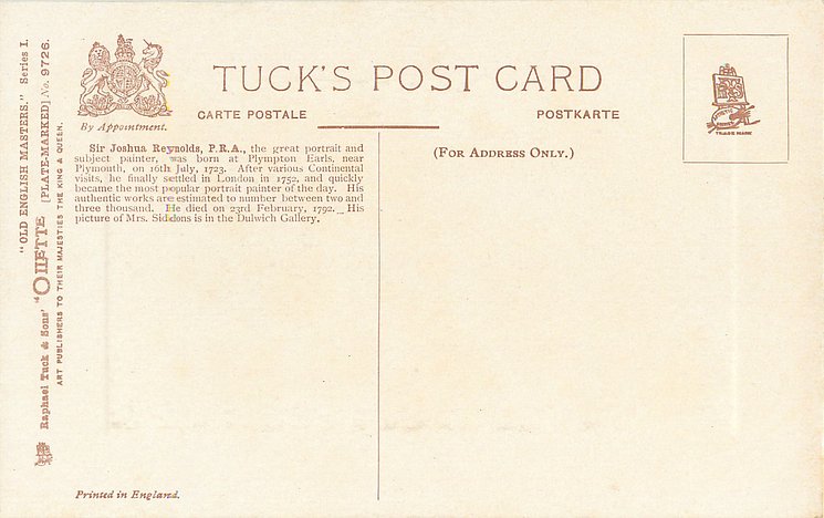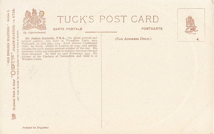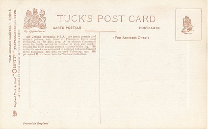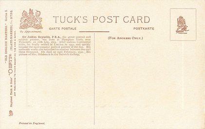 OILETTE, PLATE-MARKED, PRINTED IN ENGLAND, listed as FAMOUS BEAUTIES in 1908/1909 & 1911/1912 & as OLD MASTERS in 1930 POSTCARD Catalogues