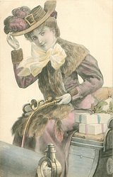 pretty girl drives antique car left, her right hand touching hat brim, presents on seat beside her