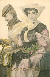 man drive antique car left, girl beside him has both hands in muff, holly on her lap