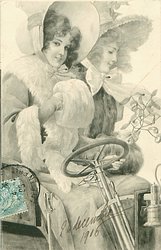 two pretty girls in winter dress drive antique car right, one has hand in fur muff, other girl holds sprig of mistletoe