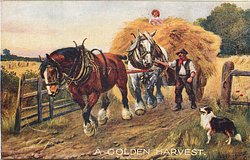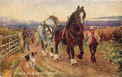 THE DAYS WORK DONE brown & white heavy horses being led home, collie accompanies