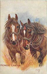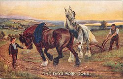 THE DAYS WORK DONE brown & white heavy horses being turned at end of furrow