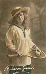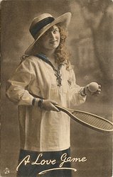 woman in tennis attire with racquet and ball, racket in her right hand, and ball in her left, she looks slightly right, wears straw hat
