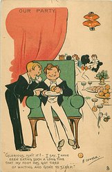 ANXIOUS MOTHER TO YOUNG HOST: "I HOPE YOU'VE GIVEN ALL YOUR GUESTS THE LARGEST ORANGES, JACK!" JACK, RUEFULLY: "NO, MOTHER, THEY TOOK 'EM!"