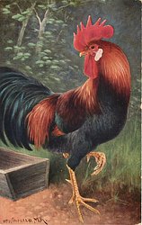 multicoloured cockerel stands on one leg, facing right but lookiing left