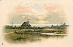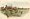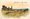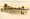 three children in grassy meadow, in front of three young blossom trees, houses left