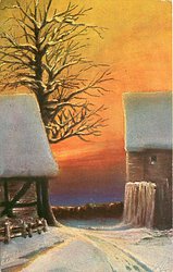 road extending back between barn on left & house right, tall leafless tree behind bard