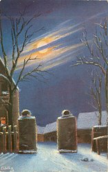 central road, farm buildings left, palisade fence leading back to lighted farm house, moon on horizon