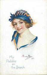 MY PEBBLE ON THE BEACH girl in blue/striped bathing costume & hat