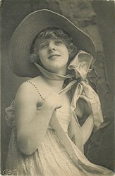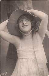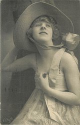 model posed in front of tree trunk, right hand behind large brimmed hat, left hand touches bow/strap chest level