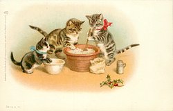 two cats work at large red pot, one stirs, kitten left with smaller bowl, tiny holly sprig front right