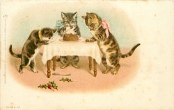 three cats at table, one licks plate, holly sprigs & spoon on floor