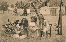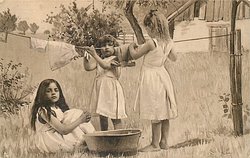 three girls play outside in country, girl on right seated in chair with hand under chin, girl in middle irons, girl on left cuddles dol