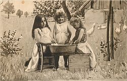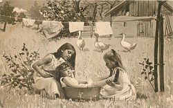 three girls play outside in country, two larger girls pretend to bath smallest, washing line & geese behind
