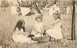 three girls pretend to bath doll in tin tub, outside in country, girl on right seated in chair