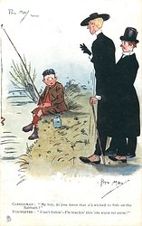 CLERGYMAN: "MY BOY, DO YOU KNOW THAT IT'S WICKED TO FISH ON THE SABBATH?" YOUNGSTER: "I ISN'T FISHIN'-I'M TEACHIN' THIS 'ERE WURM TER SWIM!"