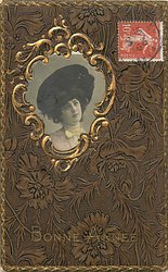 head & shoulders inset of girl facingfront, looking up/right, purple background
