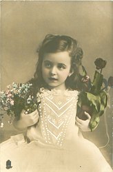she carries flowers using both hands & arms, faces front, looks front & up/left