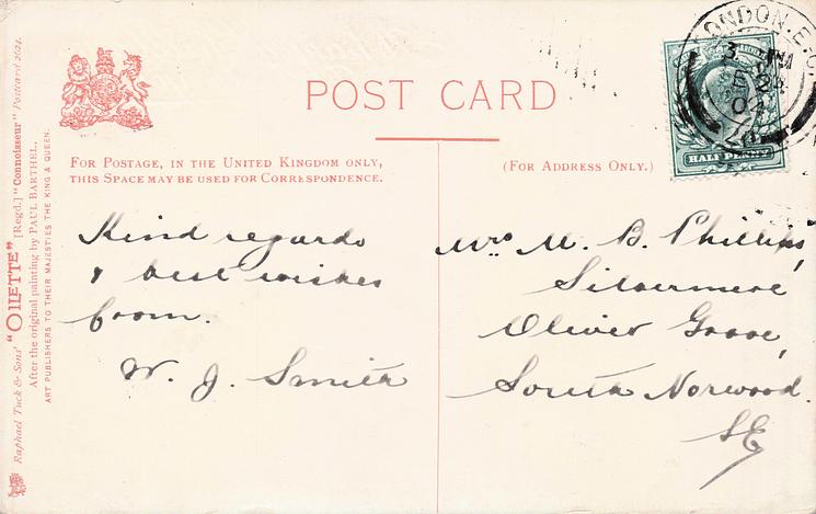 OILETTE CONNOISSEUR, 3 backs, with or w/o PRINTED IN ENGLAND, PROOF EDITION 42 was advertised 1903/1904,, listed in 1904 &1908/1909 POSTCARD Catalogue, same images French back SERIE 448, AFTER THE ORIGINAL PAINTING BY PAUL BARTHEL.