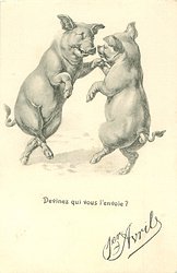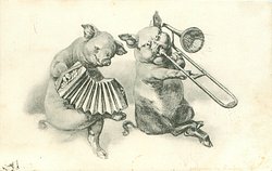six pigs move right in line on their hind legs, next to water, one in front has fallen