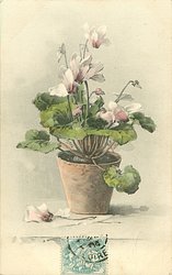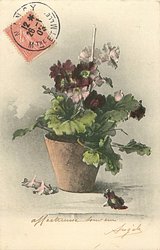 pot of multicoloured wallflowers, decorated & wrapped with light pink paper