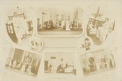 TODDLES, 8 insets THE INTRODUCTION OF "TODDLES" TO CONSTANCE and "TODDLES" ON HIS WEDDING MORNING and MRS. BOWLER AND "TODDLES" and untitled toddles, untitled woman & child and THE SCENE AT THE MAIRIE and "TODDLES" FEIGNS ILLNESS and "TODDLES" MAKES UP HI