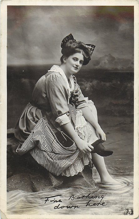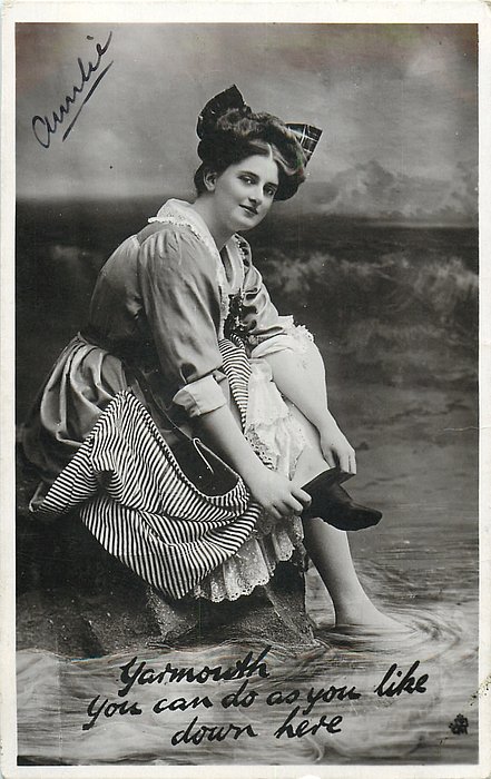 comes with FINE BATHING DOWN HERE or YARMOUTH, YOU CAN DO AS YOU LIKE DOWN HERE "written" on card