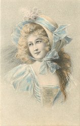 head and shoulders study of long haired pretty woman, wearing hat secured by ribbon with large bow at neck, looks left