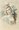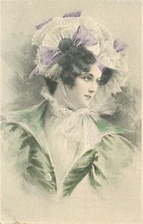 head and shoulders study of pretty woman, wearing lace head-dress secured with large bow at neck, looks to right